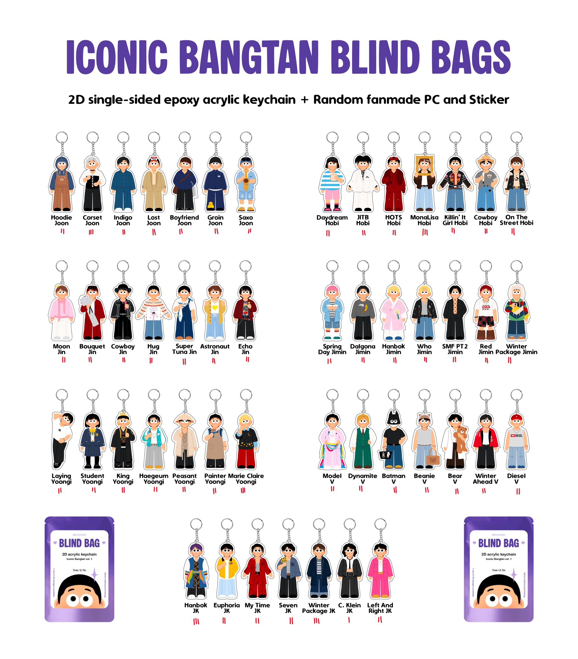 Includes 1 keychain and comes with a fanmade photocard, a sticker and a note with the name of the member design inside the box.